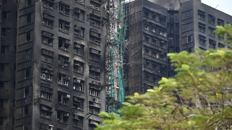香港大埔五级火|房署经与警方协调,开始移除3幢大厦已烧毁外墙棚架
